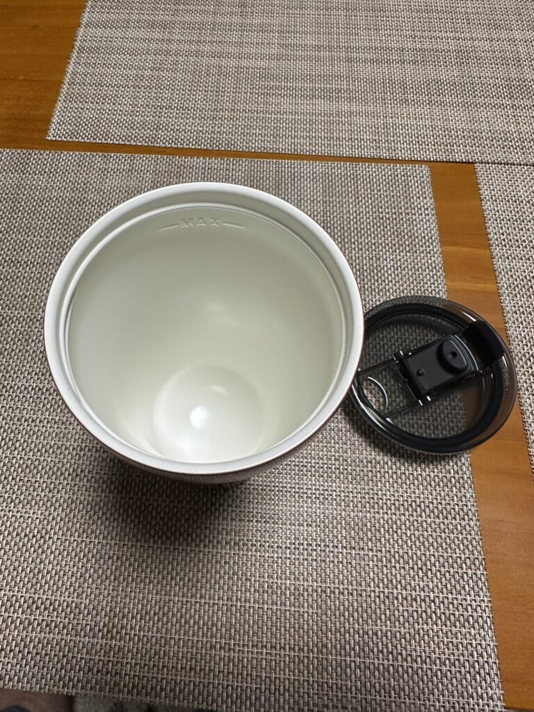 あと、内側もセラミック加工で汚れが沈着しにくいですし、底がゴム製になっており、コースターを兼ねます。これは思ったより良いですね。固い面に無造作に置いてもソフトな感じですし、もちろん滑り止めにもなります。