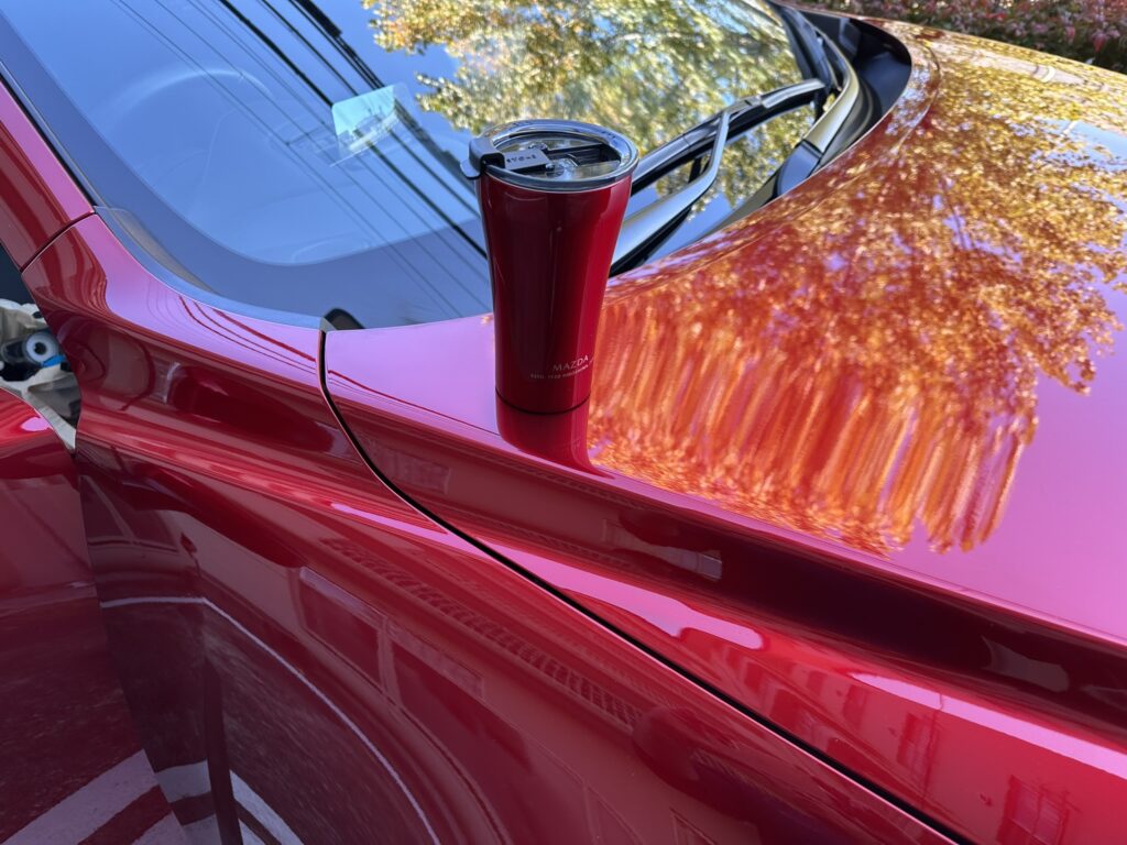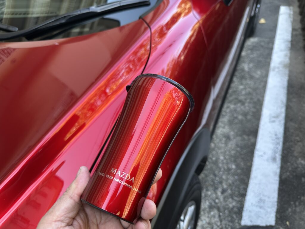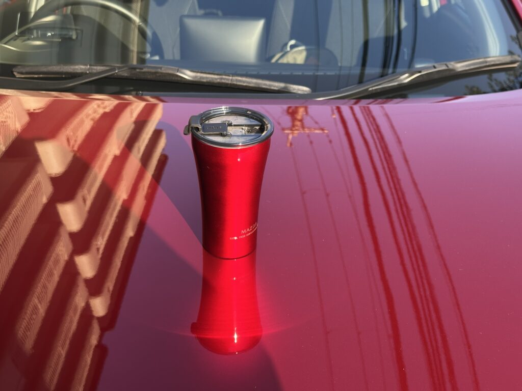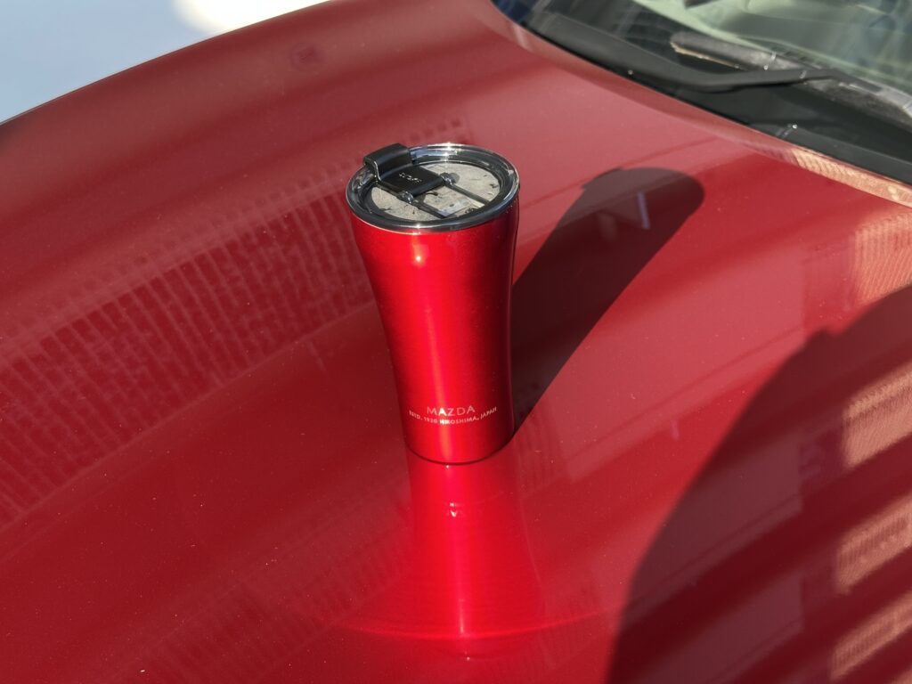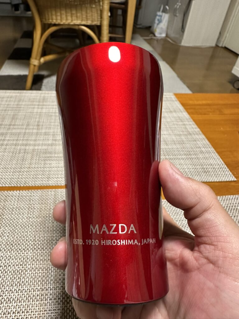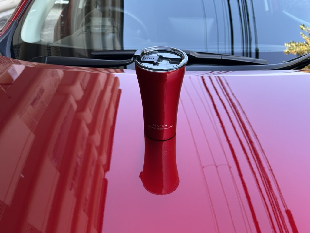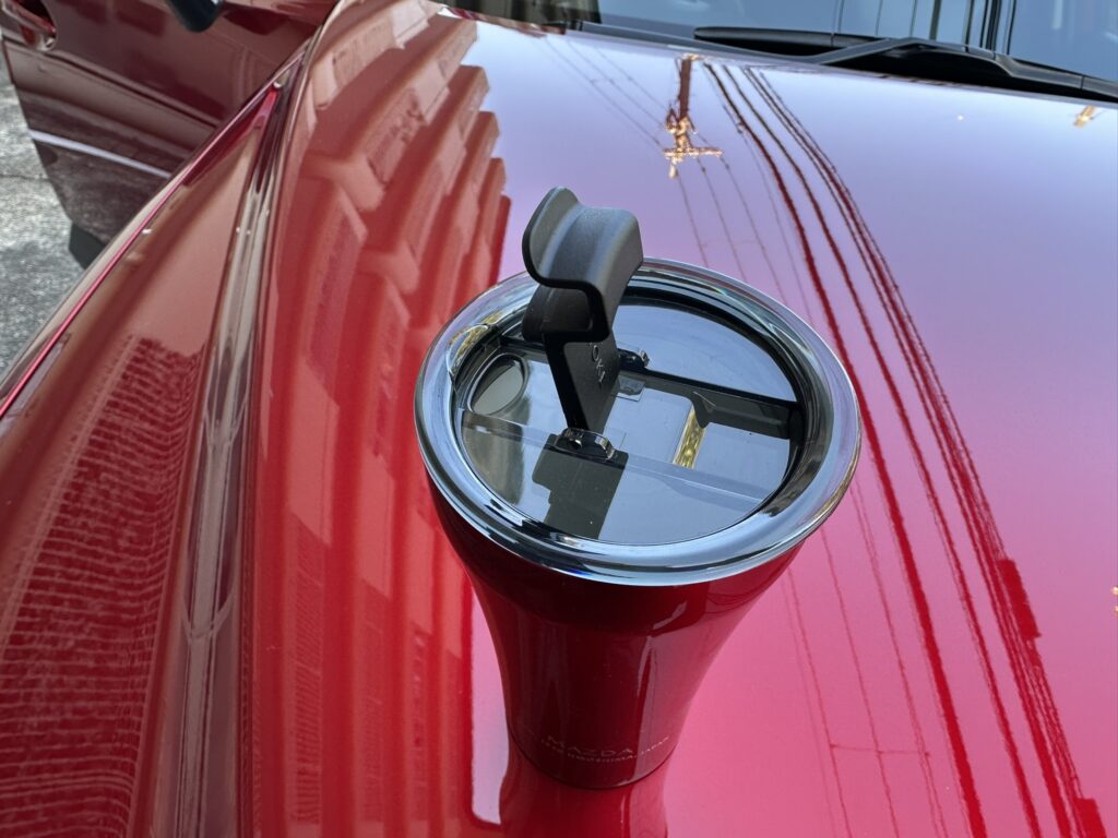 持つ部分がスリムで飲み口に向かってなだらかに広がってゆくそのスタイルは「魂動デザイン」をイメージしたと言われてもナットクしてしまいそうなオシャレ感ですが、これはSTTOKE製タンブラーのデフォルトのスタイルです。でも、マツダカラーと合わせるとやっぱり魂動デザインだよ。これは。