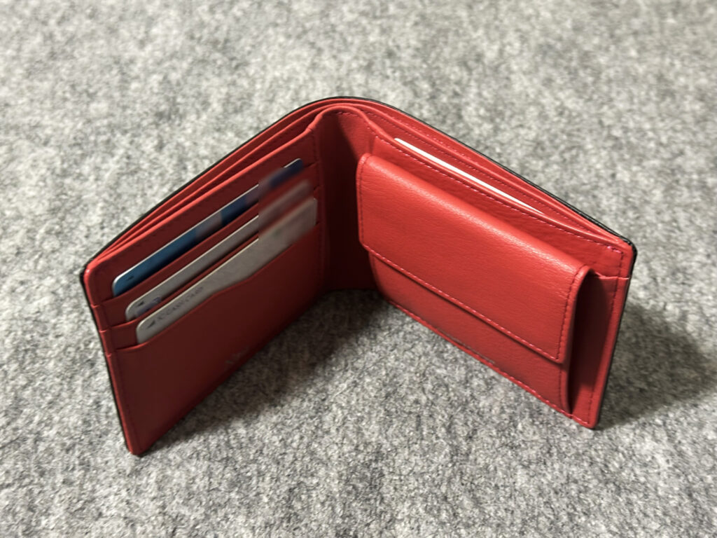 この商品の他にも似たようなイメージのものが並んでいたのですが、むやみにポケットなどが多くなく、厚みがあまりないこれを選びました。ワタシが購入したのは13,000円くらいだったかと思いますが、お値段なりの質感があります。お店のレジでサッと取り出しても安物感がなく、ブラックなのに開くと鮮やかな赤なのもイイ感じ。この赤は、ソウルレッド的な赤と言うよりはちょっと朱色がかった赤ですね。