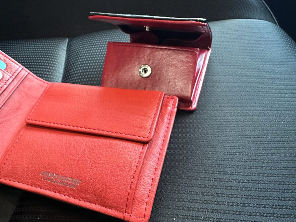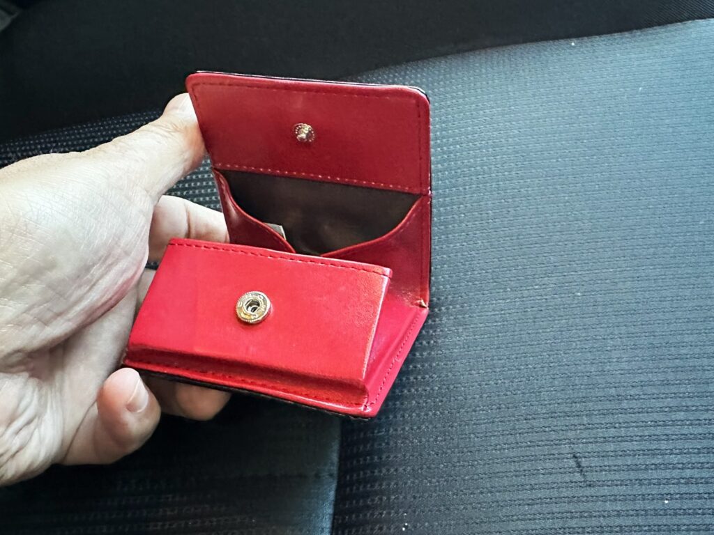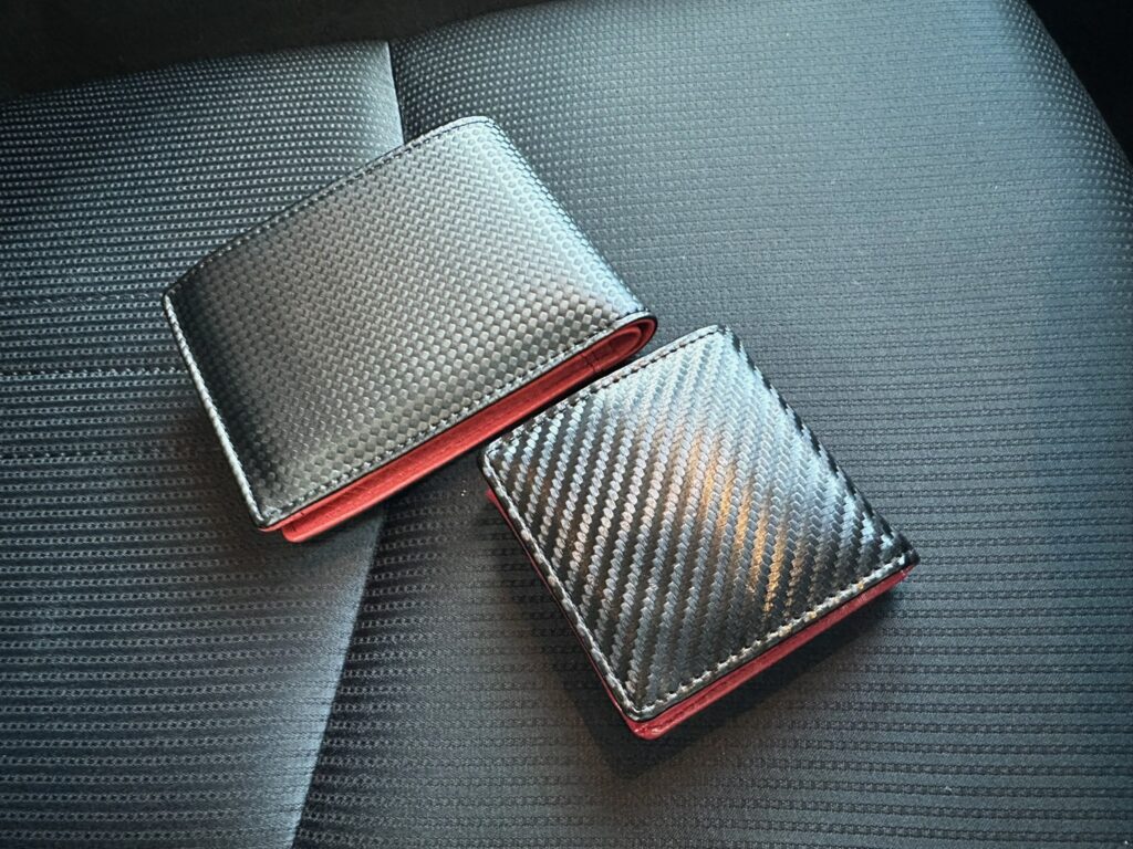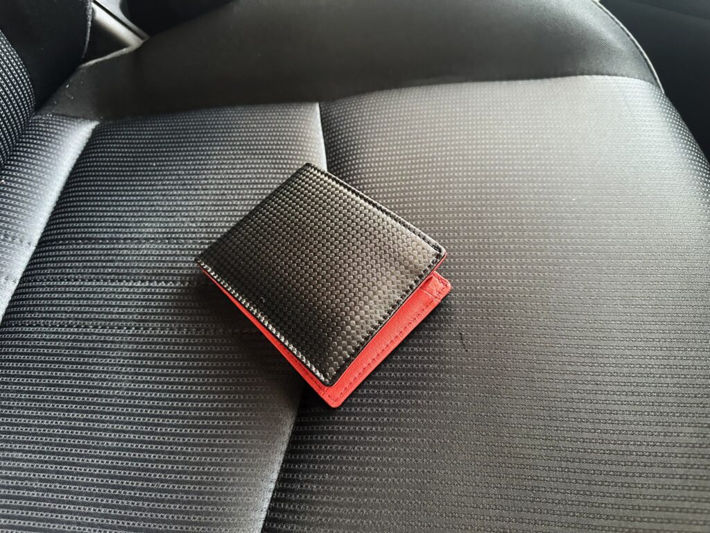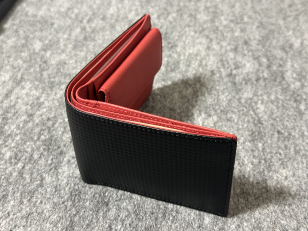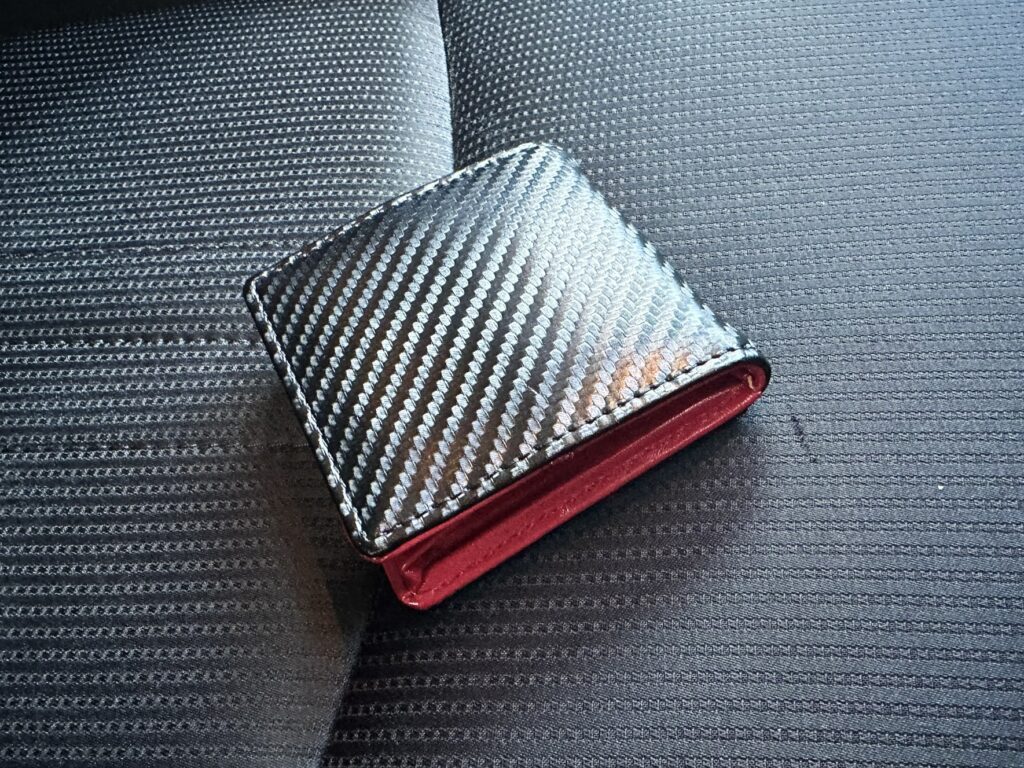 でも、この黒いカーボン調の財布はマイCX-3の黒基調のインテリアによく似合う上に、その間から差し色のように赤がのぞいているというのはとてもイイ!
