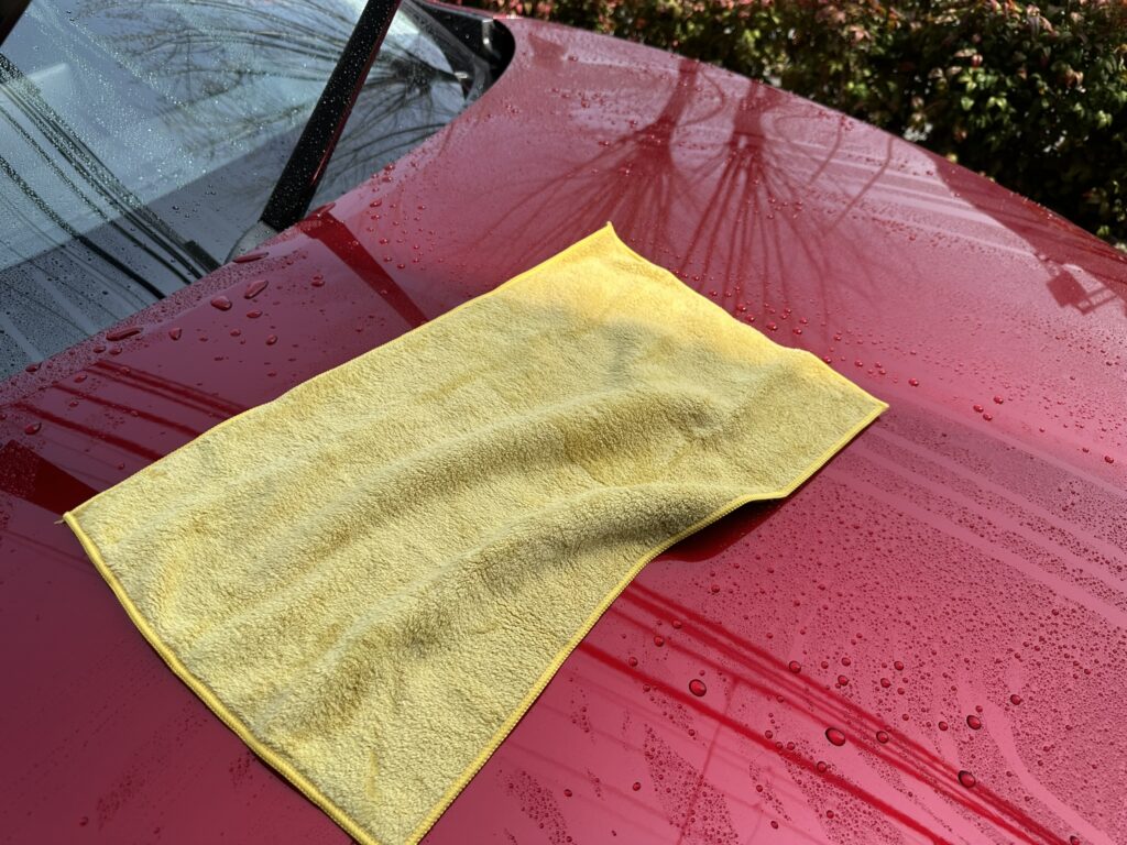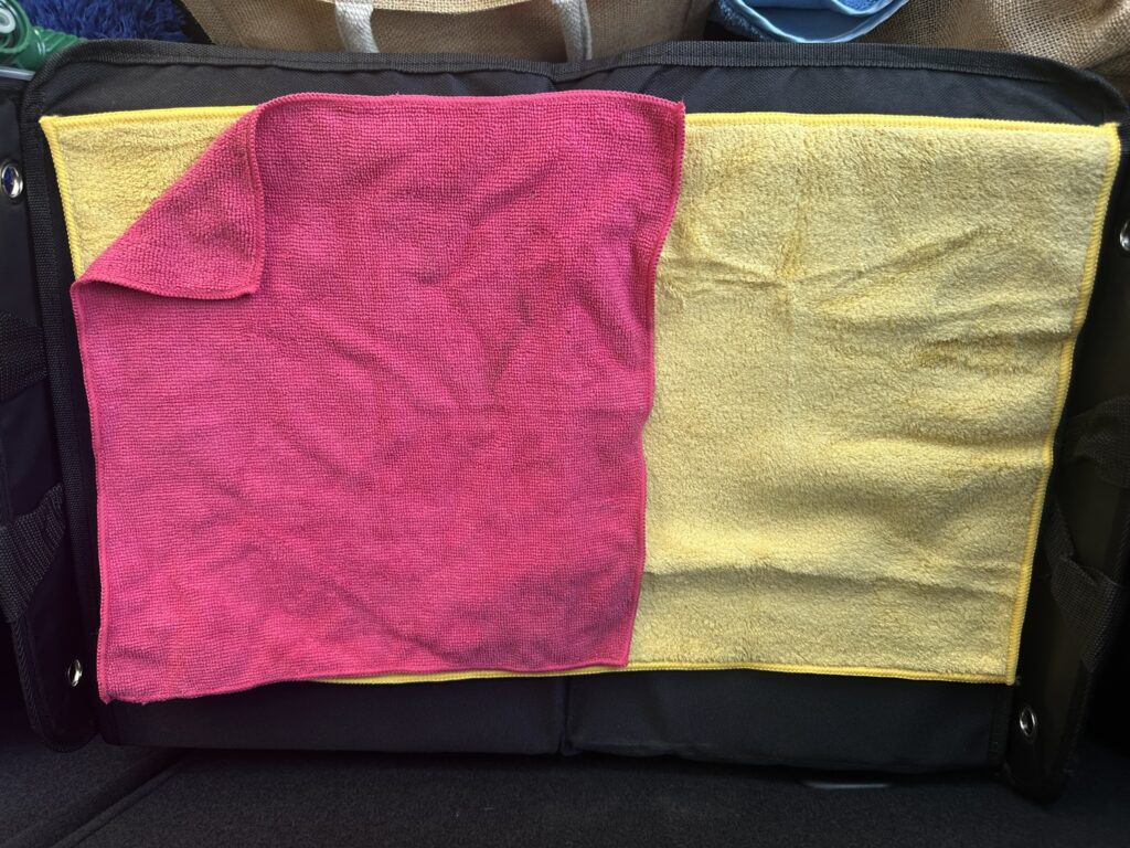 オートバックス製(AQ.)の5枚数百円のマイクロファイバークロスで充分ですし、Temuで買った身元不明のクロスでも意外と良いのがあったりします。(水を弾いてしまってなかなか吸ってくれない大ハズレ品もあった。確かにあった)
