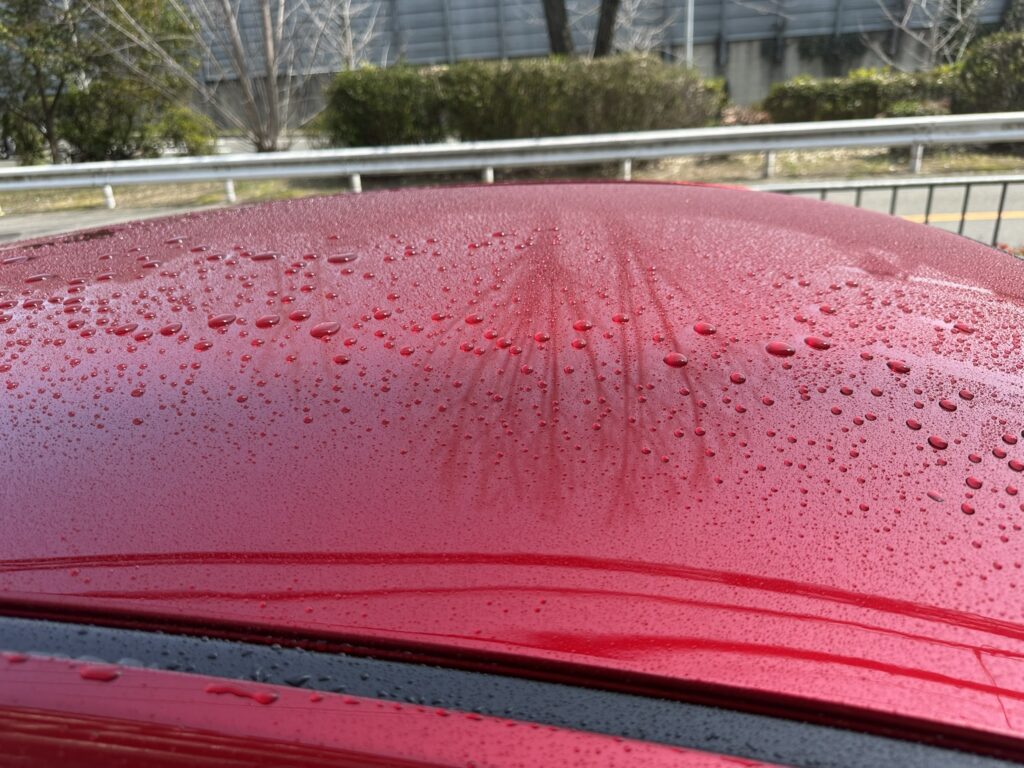 あらまあ、ホントに引っぱっただけなのですが見事に水分が拭き取られています。ちょっと見えにくいかな? ということでルーフでも試してみました。