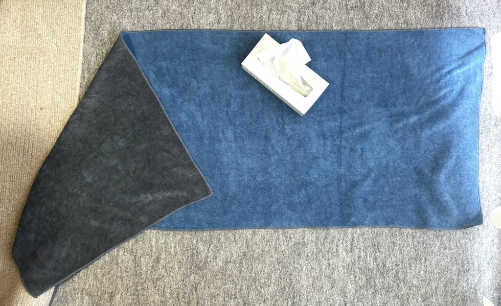 ということで、結構いろんなクロスを試してきました。ひとつひとつは取り上げませんが、意外と使え「なかった」のが大きいクロスです。大きいものでバスタオルくらい、その半分くらいのも使いました。もちろん普通の吸水性がある生地なら大きければ一気に水分は拭いてしまえるのですが……超絶絞りにくい上に作業後の乾燥も大変です。毎度持ち帰って洗って乾かすなら良いのですが、トランク内で広げておいてもなかなか乾きません。季節が悪ければカビてきそうです。ワタシが使った最大のものはコチラ。